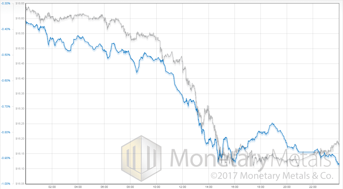 A word on this is appropriate. When we say “primarily” or “predominantly” we refer to which market was leading. The absolute change in the spread is very small relative to price. If there had been no selling in spot, and the futures price had dropped by 47 cents, then there would be a 47-cent backwardation. In such case, we would be bellowing from the rooftops about the broken silver market!